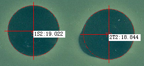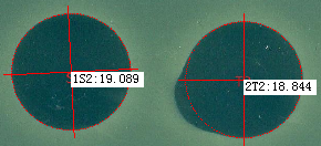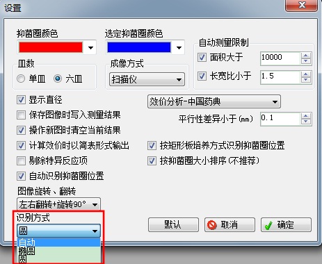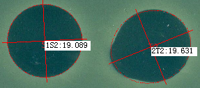識別方式分成自動、橢圓、圓3種,橢圓是原有的識別方式,這種方式識別結(jié)果與抑菌圈邊緣貼合最好;圓是按抑菌圈最圓部分來識別,對不太圓的抑菌圈識別效果好;自動是兩者的綜合。3種方式識別出來的結(jié)果略有差異,具體見下面圖像。