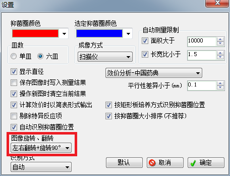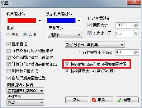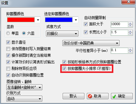 1、 按平板識(shí)別:如圖1紅框所示,選上【按平板培養(yǎng)方式識(shí)別抑菌圈位置】時(shí),系統(tǒng)將會(huì)按平板方式識(shí)別抑菌圈位置(