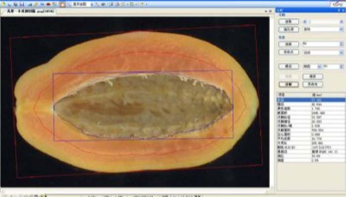 (2)可測哈密瓜等甜瓜的:縱徑、橫徑、果形指數(shù)、截面積、肉厚、外周長、瓤色分檔分析、種腔(縱徑、橫徑、面積)。