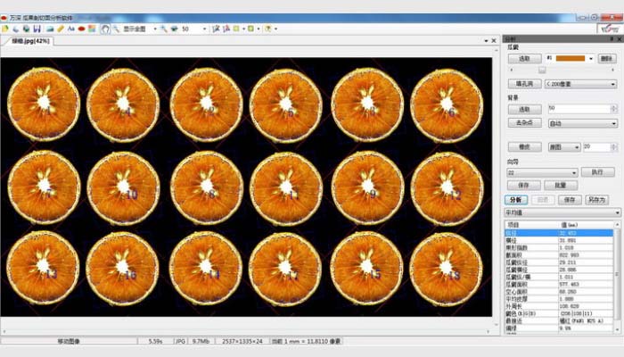 (4)可同時測量30只柑橘類水果的:縱徑、橫徑、果形指數(shù)、總面積、皮厚、肉色分檔分析、外周長。