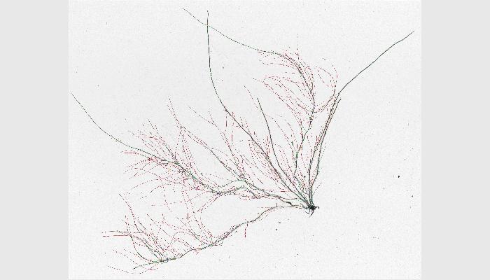 (4)能進行根系的拓撲分析,自動確定根的連接數(shù)、關系角等,還能單獨地自動分析主根或任意一支側根的長度和分叉數(shù)等,可單獨顯示標記根系的任意直徑段相應各參數(shù)(分檔數(shù)、檔直徑范圍任意可改,可不等間距地自定義),并能進行根的分叉裁剪、合并、連接等修正,修正操作能回退,以快速獲得100%正確的結果。