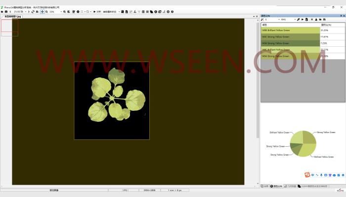 (3)顏色分析:RGB、LAB顏色值,具有葉片顏色自動矯正特性,可按英國皇家園林協(xié)會RHS比色卡2015版來自動比色?砂粗付伾珨(shù)進行聚類分割,并統(tǒng)計顏色分布及面積占比。